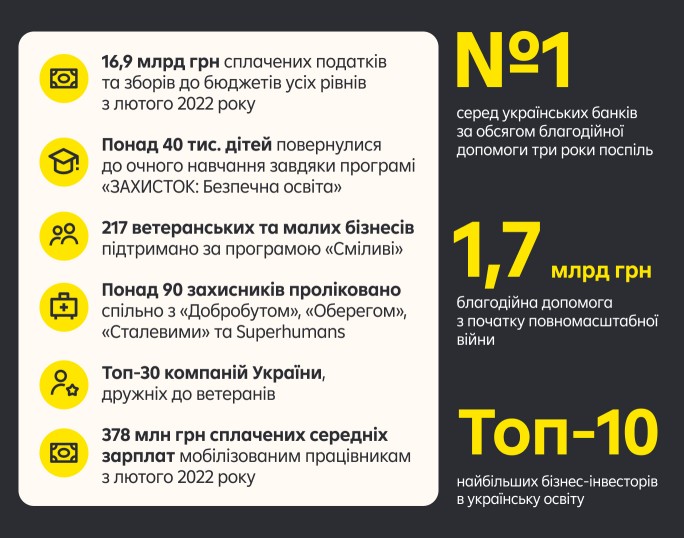 Райф продовжує послідовно підтримувати розвиток освіти в Україні та допомагати ветеранам та родинам військових. Благодійний внесок банку у розмірі 1 243 800 грн профінансує шість грантів на навчання у Київській школі економіки (KSE) для дітей Захисників і Захисниць України – як тих, хто нині боронить державу, так і тих, хто зробив це ціною власного життя.
